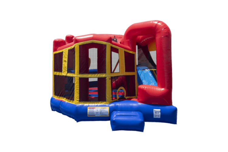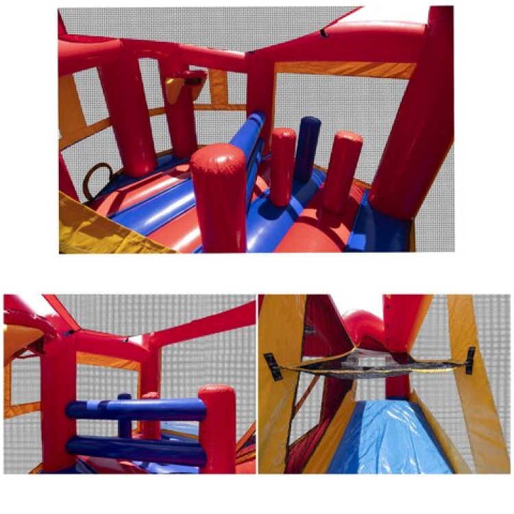 Featuring a large interior jumping area with a basketball hoop, log obstacles, and pop-up features, the 5-in-1 combo style bounce house is the epitome of inflatable jumpers. With a climb feature and a convenient exit slide, it guarantees extended periods of active fun. The 360-degree mesh sides provide parents and spectators with a clear view, enhancing the overall experience of this moonwalk.