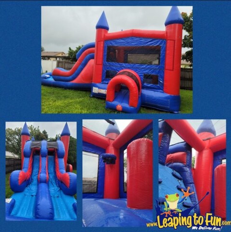 Some inflatables stand out more than others, and the Castle Dual Lane Combo is as spectacular as party inflatables get! Towering over 14ft tall, this large combo unit features castle-style spires and royal shades of red and blue. On the side, youll find the attached inflatable slide that feeds into a cushioned ramp at the bottom! This attractive inflatable can further be customized, as the banner in the front can be swapped out to best fit your occasion or theme!