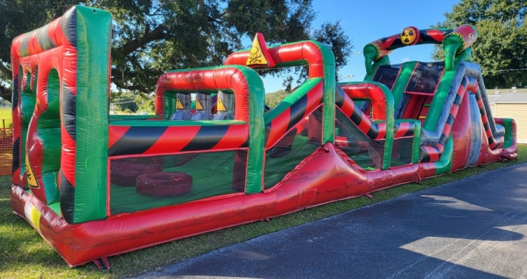 Leaping To Fun Party Rentals offers a great selection of obstacle course rentals in St. Cloud, Fl. Our 65' Red Toxic Challenge Obstacle is built to impress! Its vibrant colors set the mood for a good time! This two person entrance obstacle course challange features log jams, obstacle poles, a ladder climb wall, crawl throughs before you get to a large ladder climb and slide at the end to a big pool or hit the bumper if used dry. Guests can race each other till they drop in this big bounce house obstacle rental for adults and kids.
